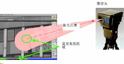 工作時,激光發(fā)射裝置發(fā)射出編碼掃描激光束,每次照射覆蓋5度X 4 度的區(qū)域;與它同步的激光接收裝置隨即獲得激光圖像和該區(qū)域的可見光圖像。兩種圖像傳送至遙控單元后,由系統(tǒng)自動比較兩者的細微差別。如有差異,系統(tǒng)將在0.1秒內(nèi)啟動警報,并在監(jiān)視器上顯示發(fā)生異常的位置和圖像。操縱人員可以通過控制手柄放大觀察可疑區(qū)域,以進一步確認是否存在問題。